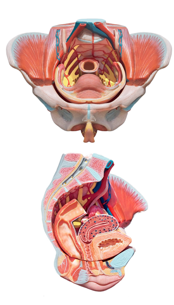 Possiamo immaginarlo anche come un’amaca: le funi di sospensione lo legano alla pelvi (bacino osseo), e sulle fasce muscolari si appoggiano gli organi: la vescica anteriormente, l’utero nel mezzo e il retto posteriormente.